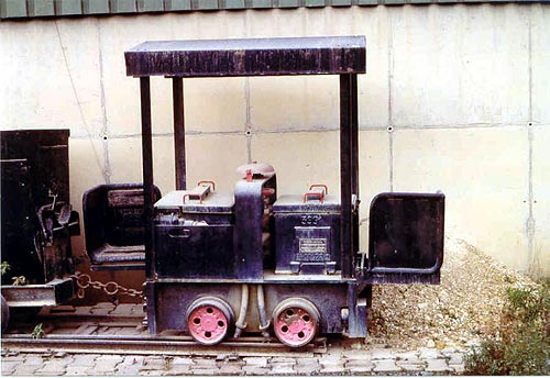 22.05.2004/ jm/ Als Denkmal steht bei der Einfahrt eine kleine Bartz-Akkugrubenlok zusammen mit zwei Loren. Fotografierbar ist das ganze bis nachmittags.