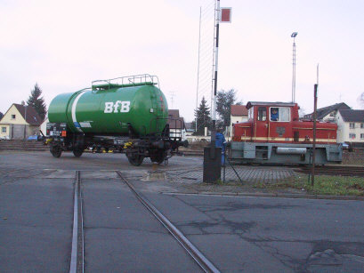 12.12.2003/ ac/ Heute fand die Übergabe des letzten Kesselwagens der Bundesmonopolverwaltung in Neu Isenburg statt, damit ist diese Werkbahn eingestellt. Die Lok wurde am 16.12.2003 auf einen Tiefladewagen verladen am Freitag den 19.12.2003 abtransportiert. In Neu Isenburg gleich vier Drehscheiben (zwei davon im Werk) vorhanden, die auch von der Lok benutzt wurden. Die Kesselwagen wurden alle nach Nürnberg-Ost umbeheimatet.