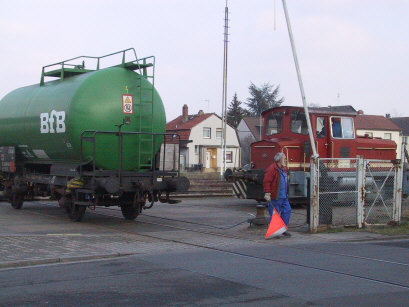 Das Werk kann nur über eine Drehscheibe erreicht werden, da das Einfahrtgleis in das Werk um 90 Grad zum Anschlußgleis steht. Lok und Wagen passen aber zusammen nicht auf die Waggondrehscheibe. Deshalb wird zuerst der Waggon auf die Drehscheibe gestellt und dann mittels Poller und Stahlseil von der Lok gedreht. Danach erhält der Wagen über das Seil von der Lok soviel Schwung, so daß diese über die Straße ins Werk rollt. Der Rangierer sichert dabei die Straße mit der Fahne.