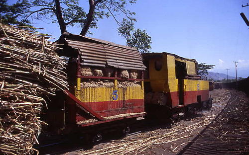 10.08.2003/ pk/ Es gibt nur noch eine Ringstrecke zwischen LKW-Verladung und Brecher. Die Wagen werden dabei von fünf verschiedenen Loks bewegt. Zuerst ziehen die LKWs, nachdem ihr Zuckerrohr auf einen Wagen verladen wurde, aus der Verladung. Von dort aus ziehen die Mallets den Zug zum Brecher. Dort werden sie von den zwei japanischen Dieselloks Nr. 13 und 14 durchgeschoben und wieder entladen. Nach dem entladen rollen sie an die Schöma Nr. 10. Die zieht sie dann zum Sammelbahnhof vor der LKW-Verladung. Dort werden sie dann wieder nach und nach von Ochsen-Doppelgespannen in die Verladung gezogen. Zum Besuchszeitpunkt waren die Mallets Nr. 212 und 228 an der LKW-Verladung im Einsatz. Nr. 214 stand frisch angeheizt zur nachmitttäglichen Ablösung vor dem Lokschuppen. Im Lokschuppen befanden sich weitere, teils zerlegte, abgestellte Mallets. Im Werksgelände ist Nr. 1 als Denkmal aufgestellt.